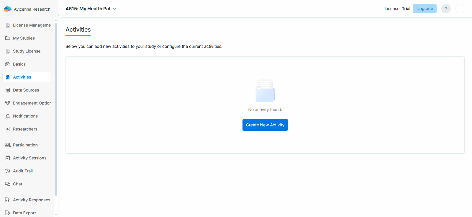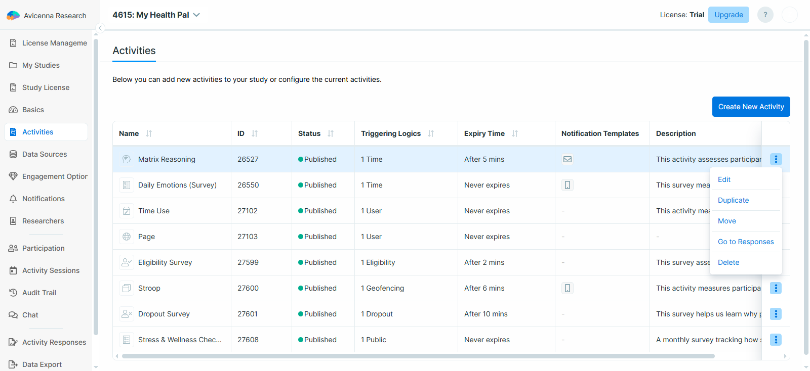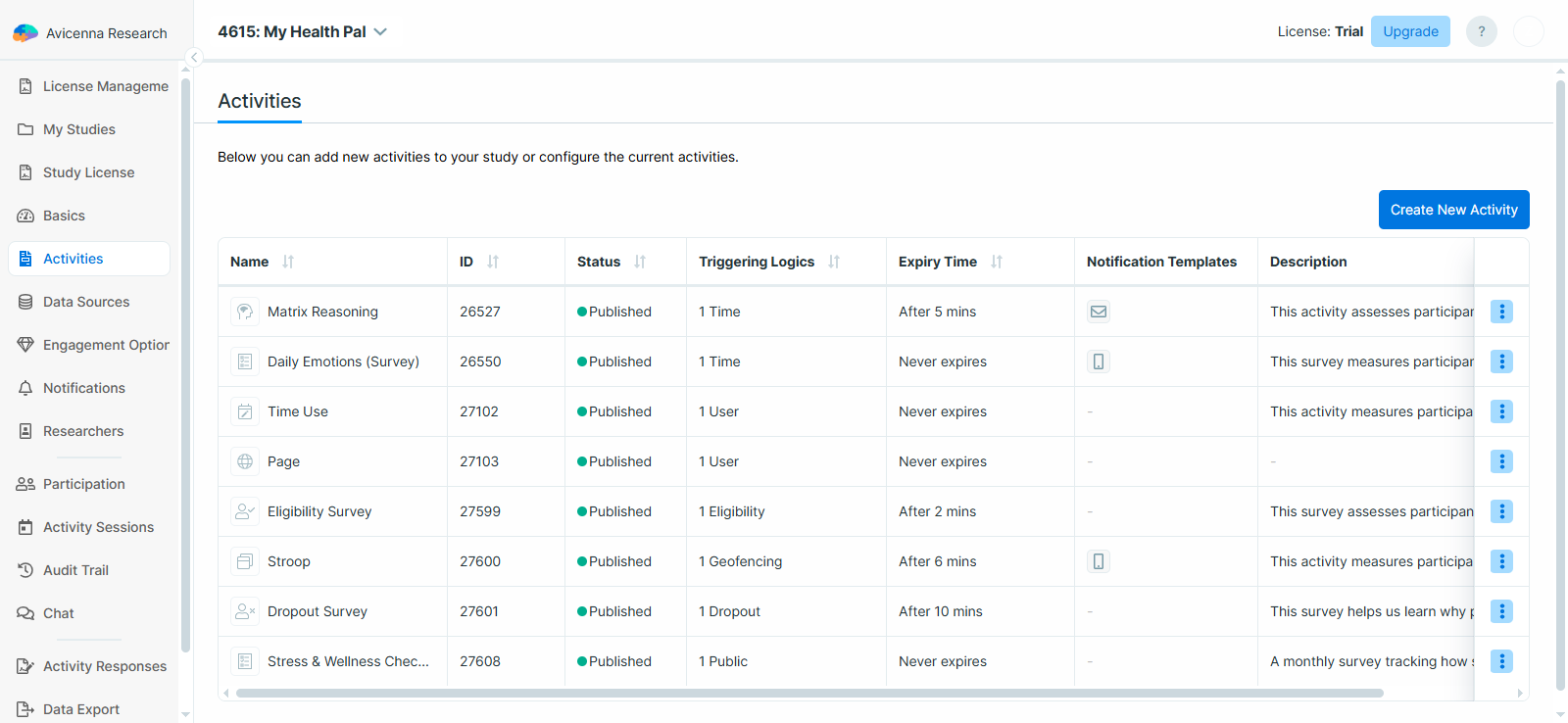 The Activities page on your Researcher Dashboard lets you create, view, and manage all the activities in your study.