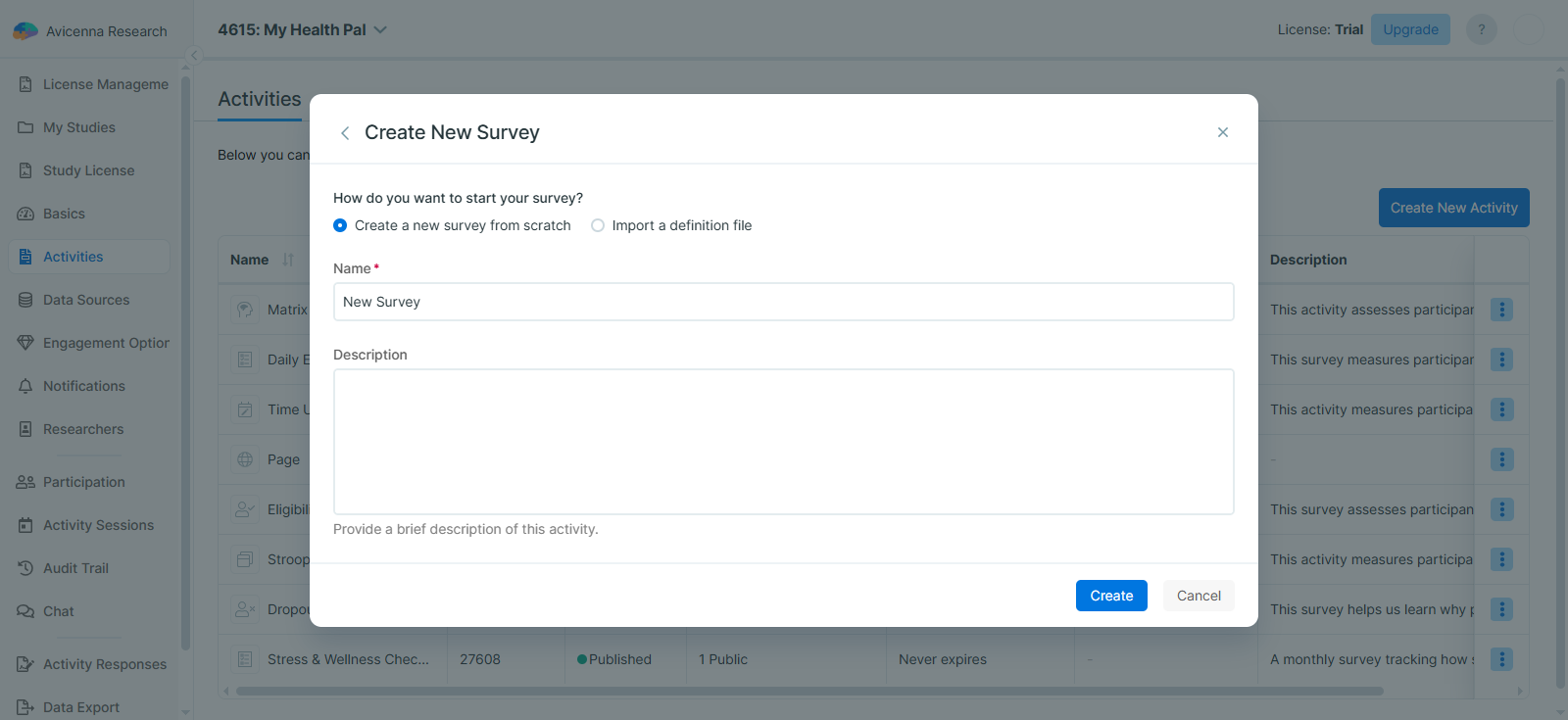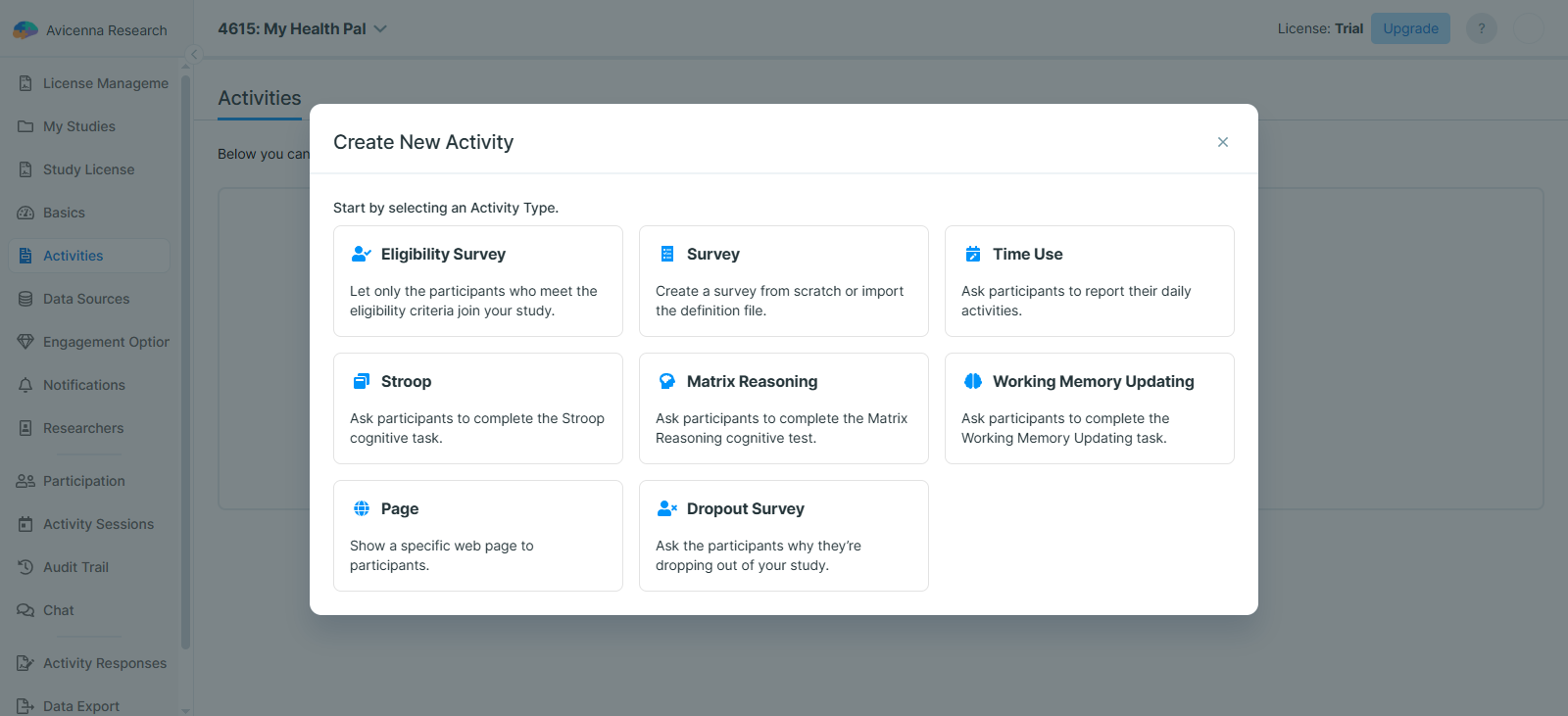 Activities are the tasks or assessments that you require participants to perform during your study. Avicenna currently supports the following activity types: