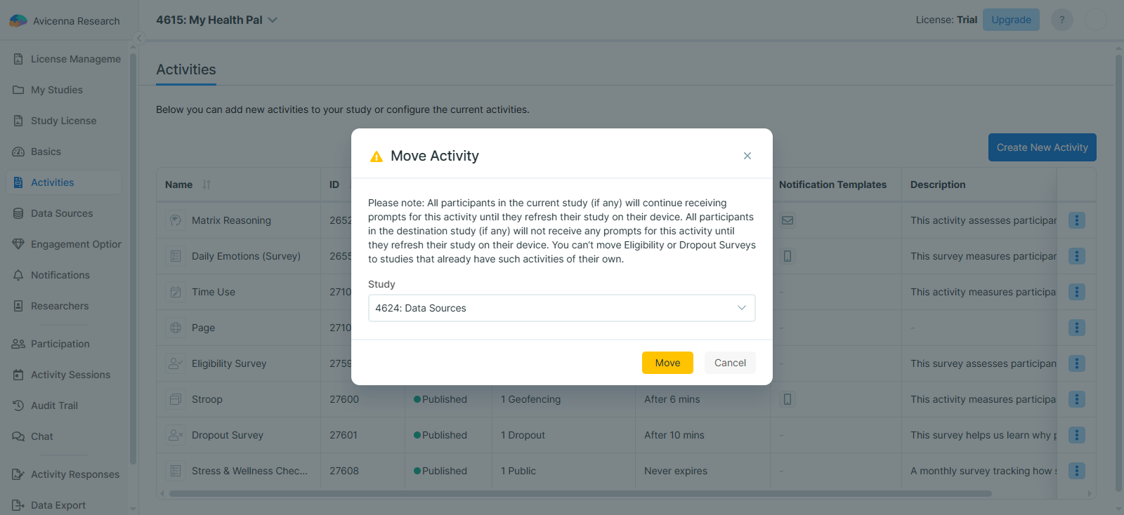 You can move an existing Activity from one study to another, allowing you to reuse an Activity without recreating it manually in another study.