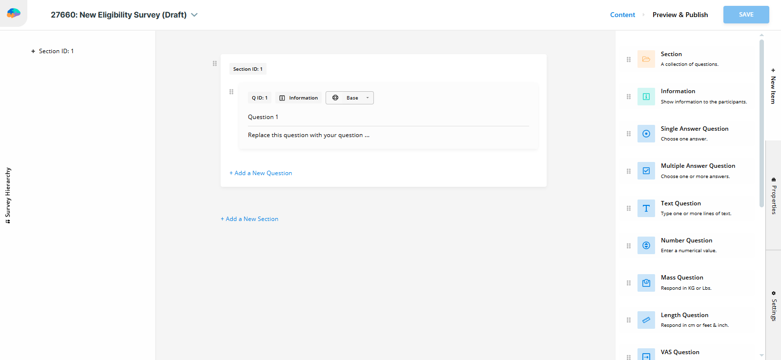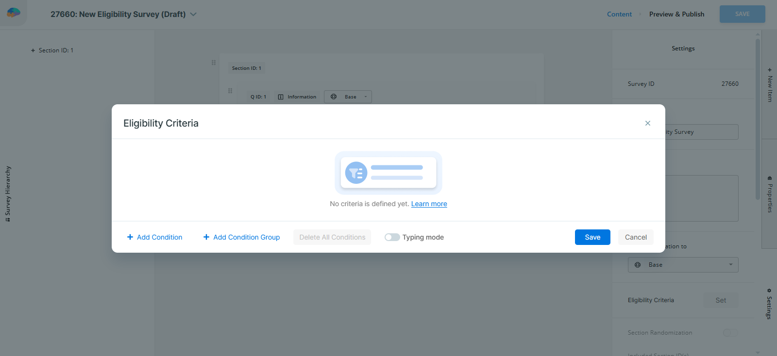 After adding the questions, go to the Settings tab on the right side. Considering the questions you have added, enter valid Criteria. These criteria determine under what conditions a participant is considered eligible and allowed to proceed and respond to the study, and which responses can mark the participant as ineligible.