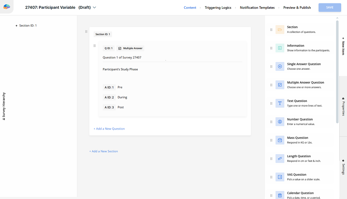 Add a Multiple Answer Question named Participant’s Study Phase with the following values: