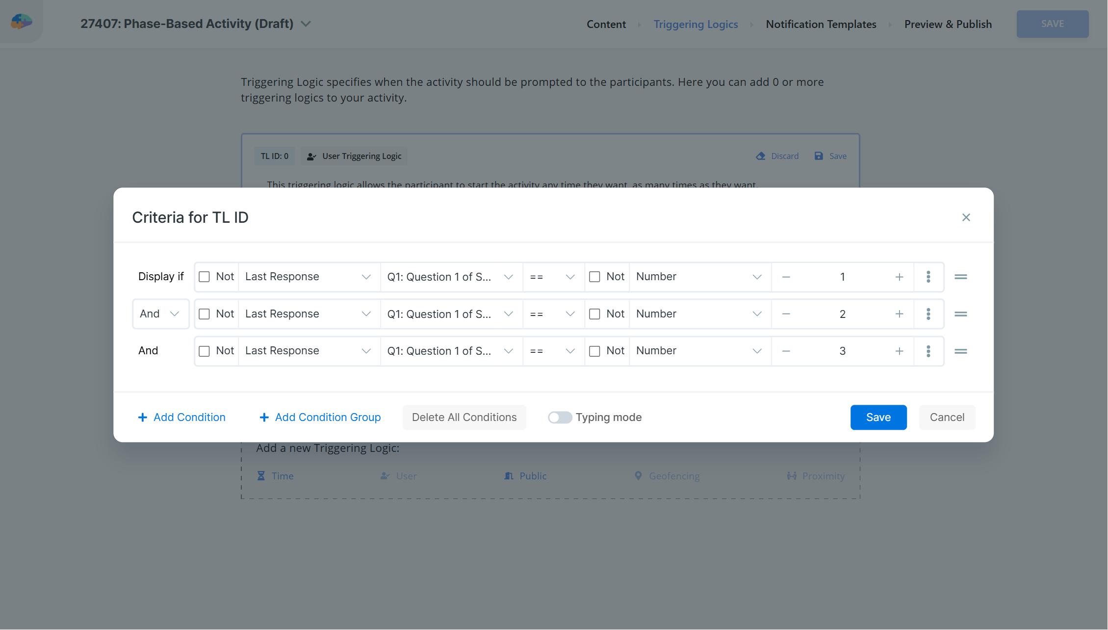 You can design a study into multiple phases (e.g., a 1‑week pre‑treatment phase, a treatment phase, and a 1‑week post‑treatment phase) by combining participant variables, criteria, and triggering logics. This guide shows a simple setup you can reuse.