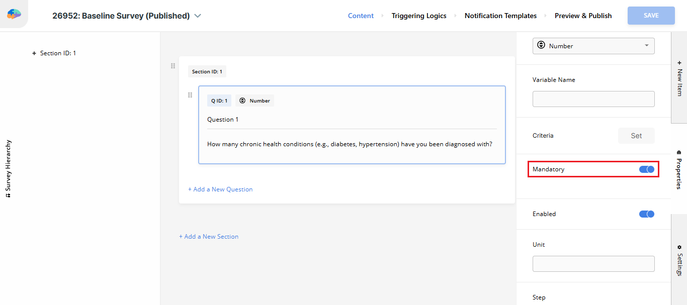 - Choose a mandatory number question that all participants must answer. You can also choose any other question that can be used in the criteria conditions. Let’s say the ID of this question is 1.