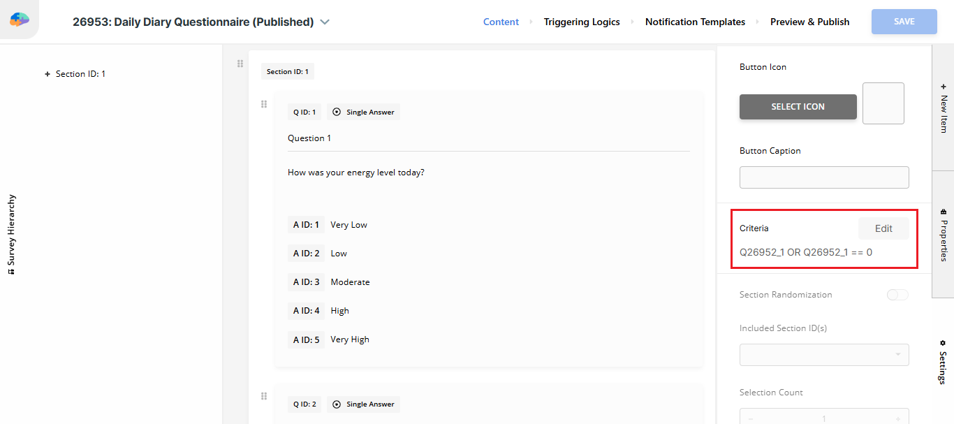 Q26952_1 OR Q26952_1 == 0This means the Daily Diary Questionnaire will only be available if the participant answered question 1 in the baseline survey. The first condition (which doesn’t have any operator) checks for any non-zero answer, and the second condition makes it complete by allowing 0 as an acceptable response.