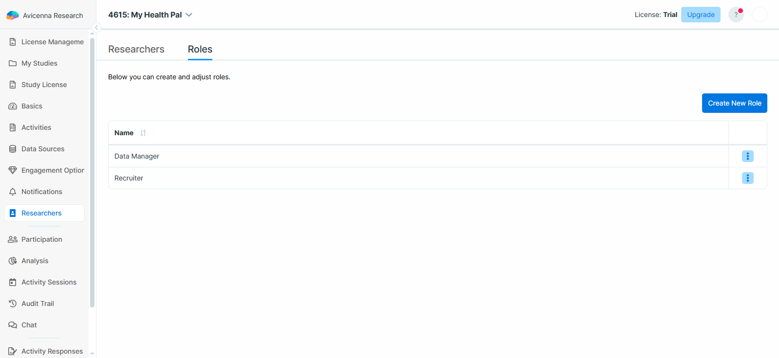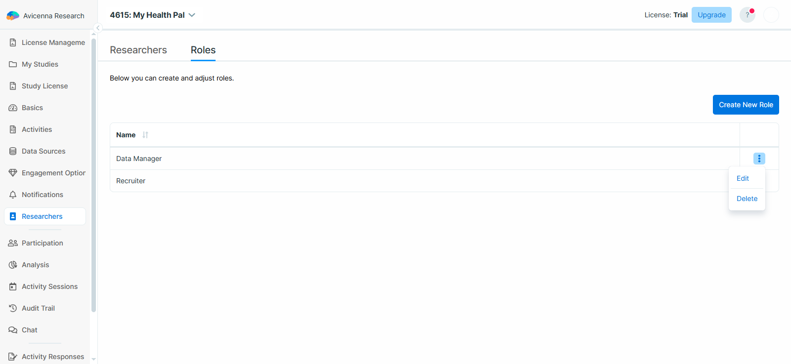 Within the Roles tab of the Researchers page on your dashboard, you can create, edit, delete, and view roles.