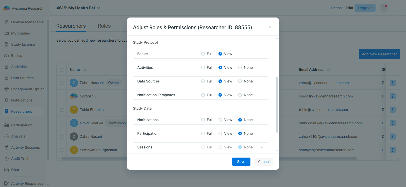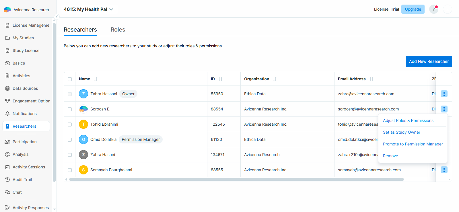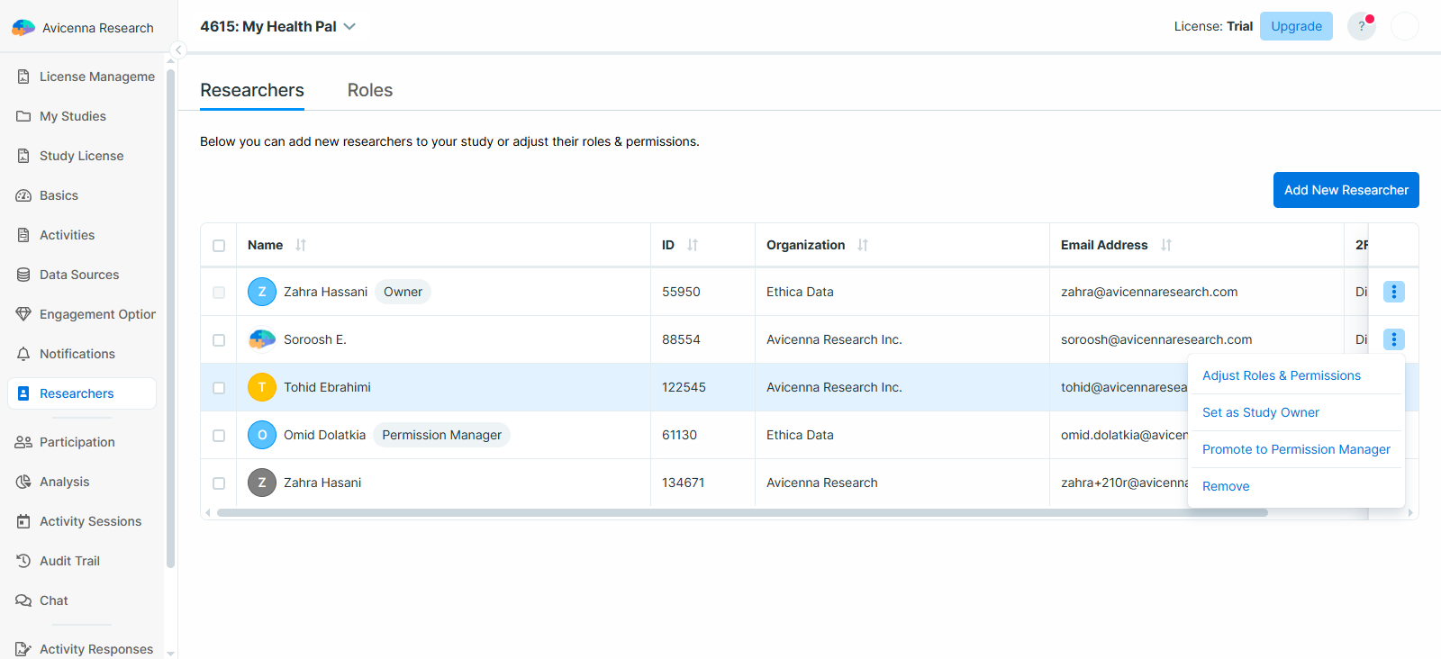 In the Researchers tab, you can invite new researchers to your study, assign or remove roles for each researcher, adjust or customize their permissions, or completely remove their access from the study.