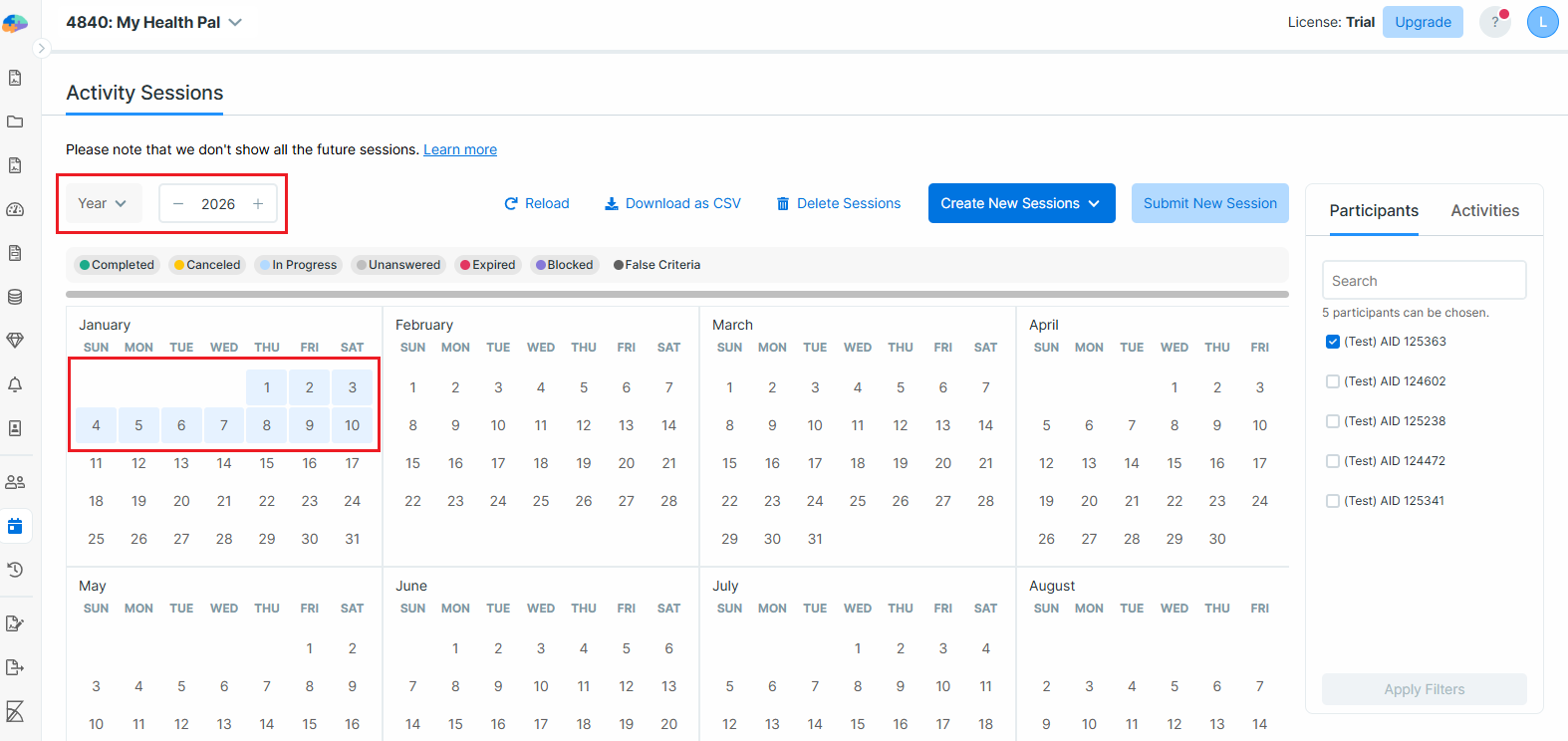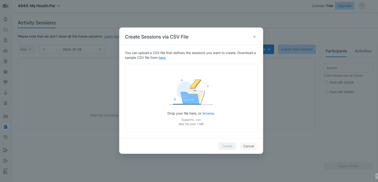 - Upload a CSV file to schedule sessions for multiple participants and activities within your study, all in a single upload.