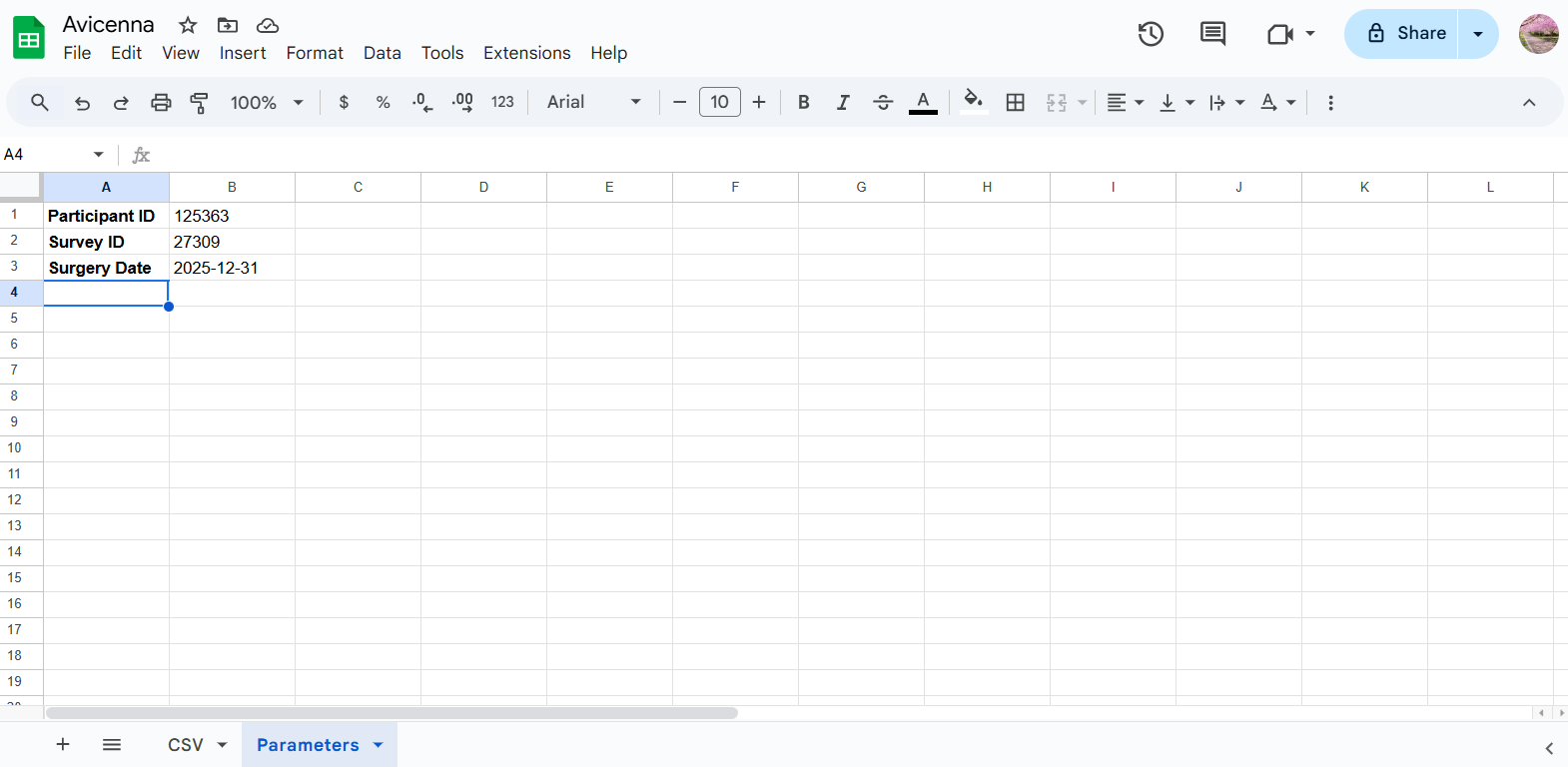Participant ID,Survey ID, andSurgery Date. You can set some values for them. -