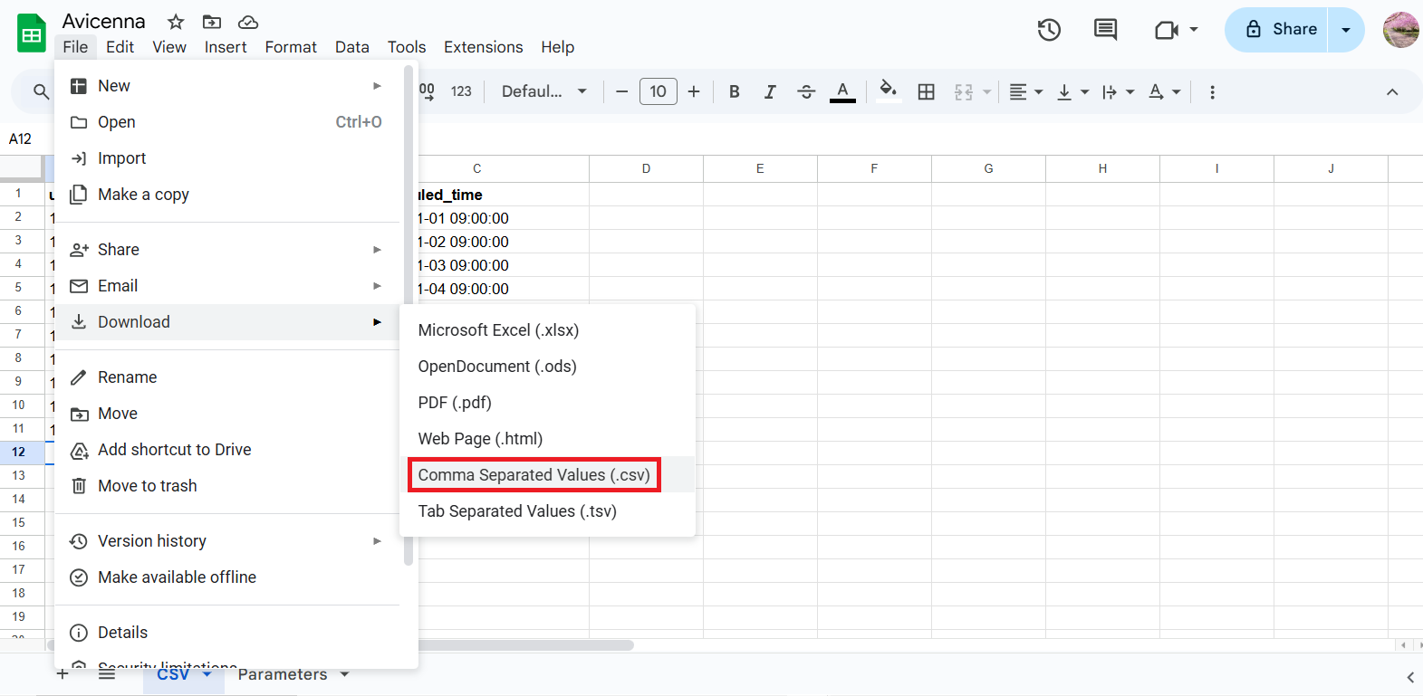 CSVsheet: To do this, go to File > Download and choose Comma Separated Values (.csv). -
