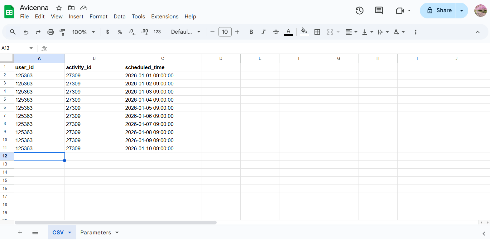 user_id,activity_id, andscheduled_time. The sheet should contain 10 rows, plus a header row. Use the Google Sheets formula and parameters to populate the first sheet:- For cells under the